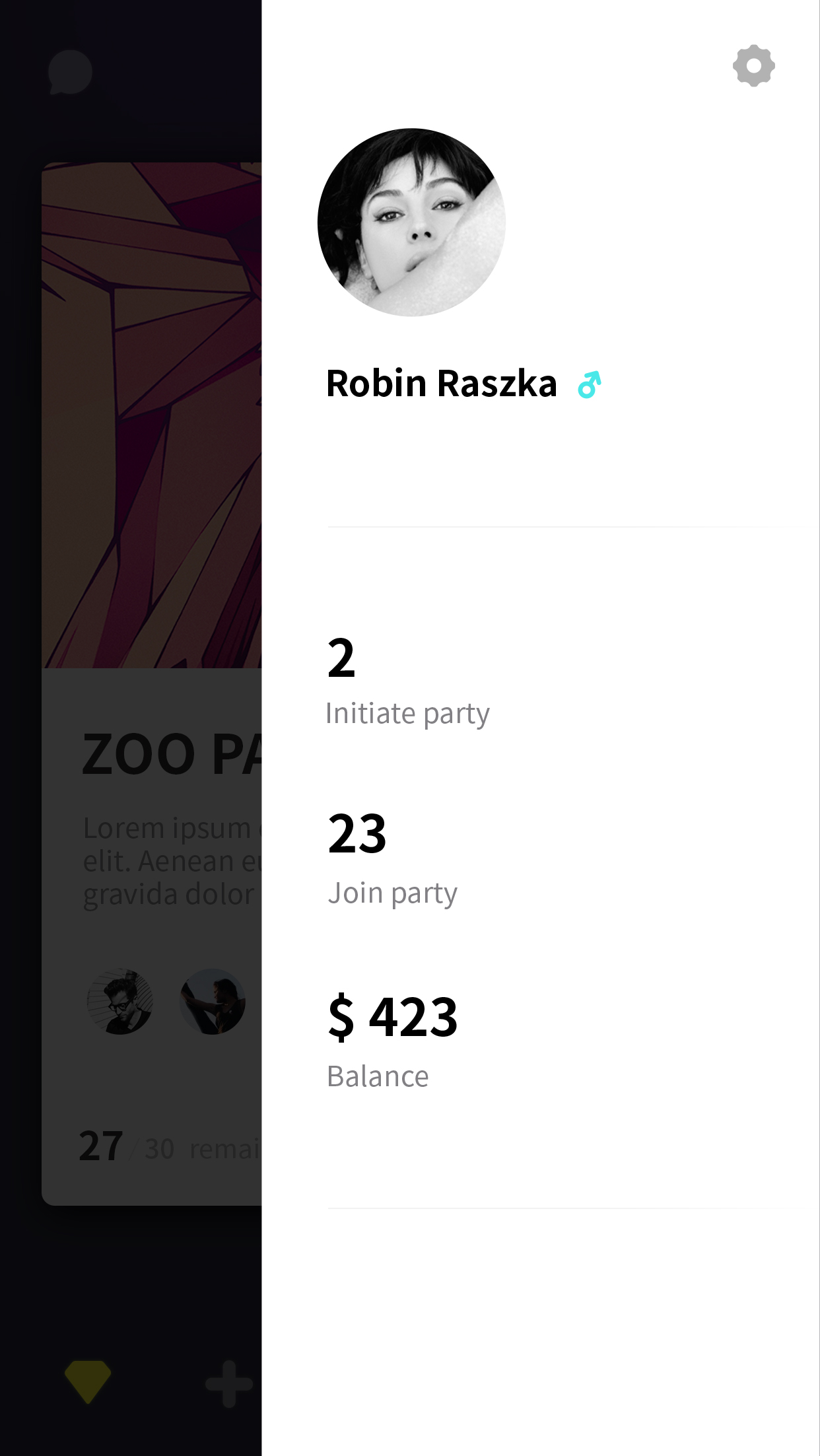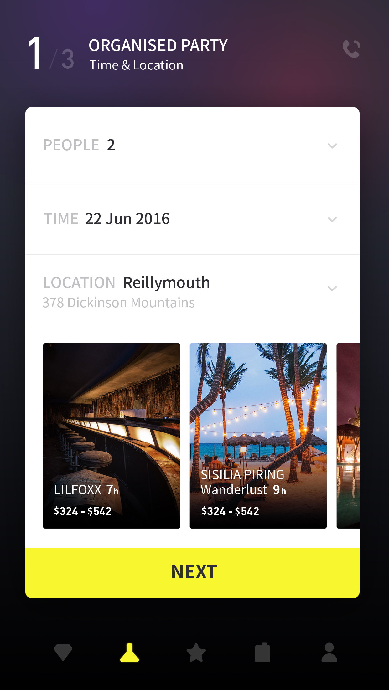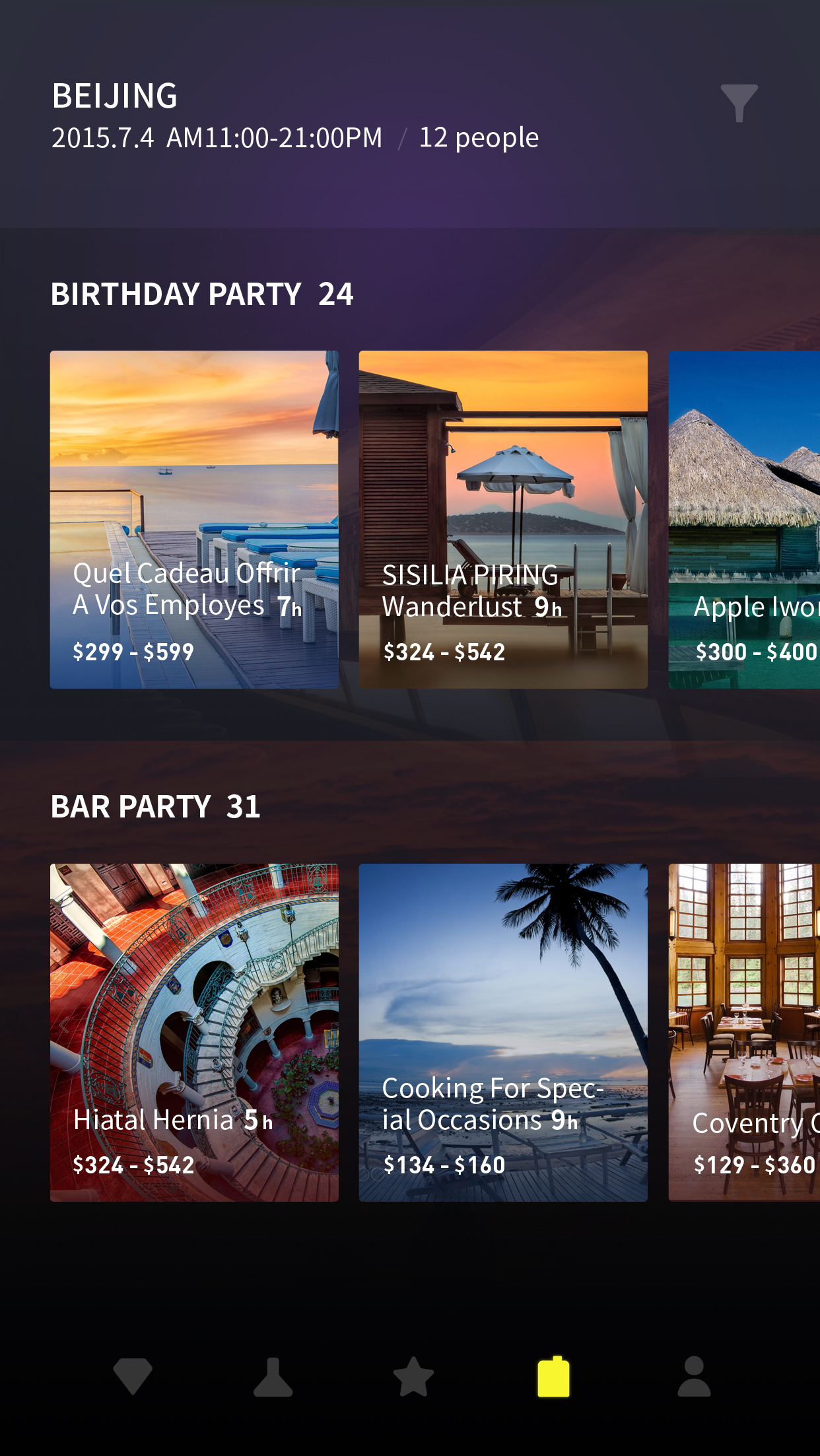 Independent card content display - As each party is independent and special, the quantity is not too much but refined, so the independent card interaction mode is very suitable for this product. First, users can focus on a theme party. Second, the steps are clearly showed through successive shift of different screen when creating the party. What’s more, different disposal to each party by using the whole image can be utilized to show its uniqueness visually.