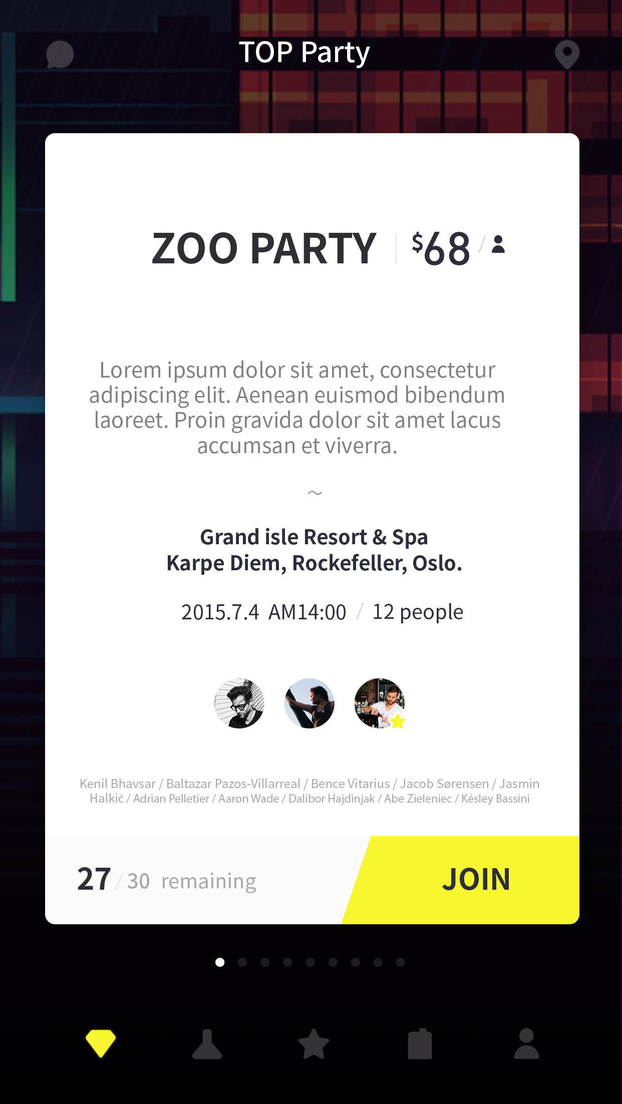 荧光夜店风格设计。派对主要用户年龄层在15-25之间,派对的地点也是酒吧,迪厅,KTV之类的娱乐场所,整体的应用设计继承了这种荧光效果。柠檬黄体现着活力年轻,作为点击的入口具有很强的引导性。把不常用的导航缩小化处理,因为每个导航的内容其实是不同的玩法,而不同类型的用户会聚焦在一个导航中使用产品,这样切换的频率会大大减小。图标缩小会使得整体的应用结构很清晰,也为当前页面展示内容节省了更多的空间。