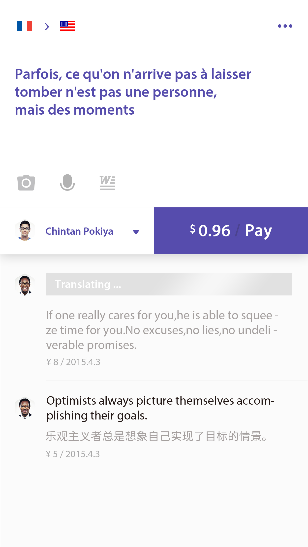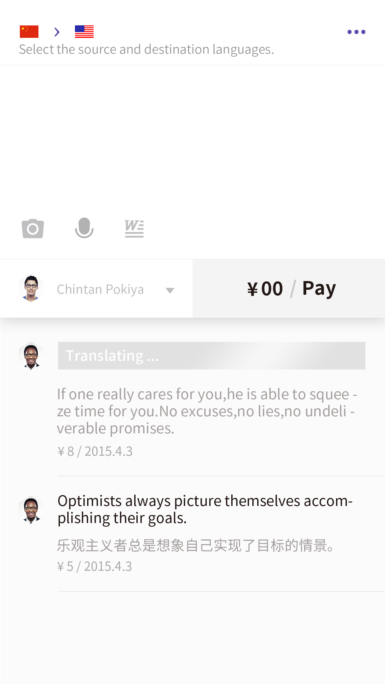 这个是我自发的产品想法,但目前没能力实现,这个app主要提供一个线上人工翻译的平台,用户在平台上发翻译需求,系统会根据市场平均价格算出需要的金额。同意并支付后,线上的翻译官可以接需求并领取金额。手机终端主要解决碎片化的简易需求,比如翻译店名,景区的旅游牌,当地的产品介绍,药瓶化妆品等。网站终端可以翻译长篇和专业的文章。