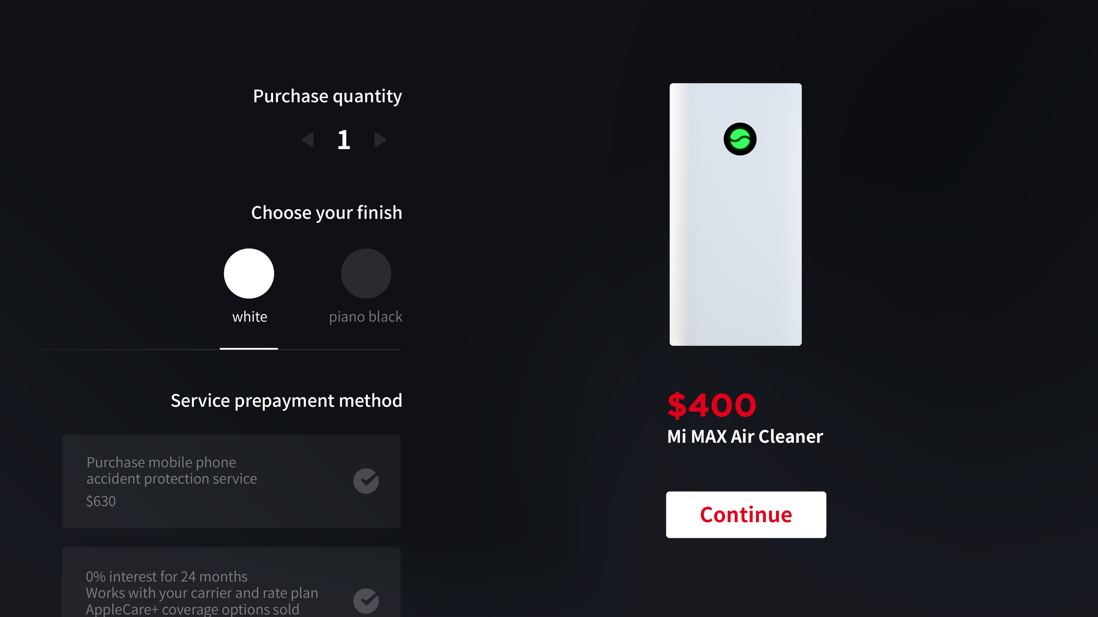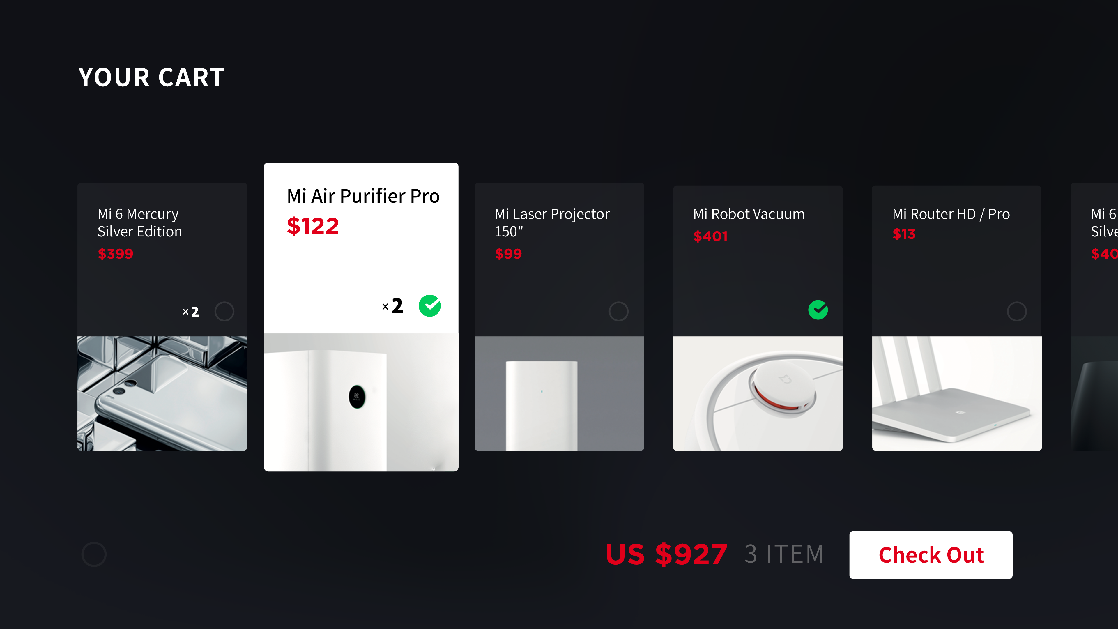 这个是从实景商城首页进入的所有商品列表页面,此设计的独特性在于最大化的去展示产品性能和外观的美,层级通过上下两层简单的上下键来切换,商品详情页把商品的信息最大化,通过三维旋转和信息图形展示产品硬件细节和内部构造,通过动画显示出产品工作时的状态,通过评论和用户晒单实拍图片展示产品体现真实优秀特性。统一的色调也是全方位在设计上定义了小米产品的品牌定位和公司气质。永远做高端的产品最低的价格。