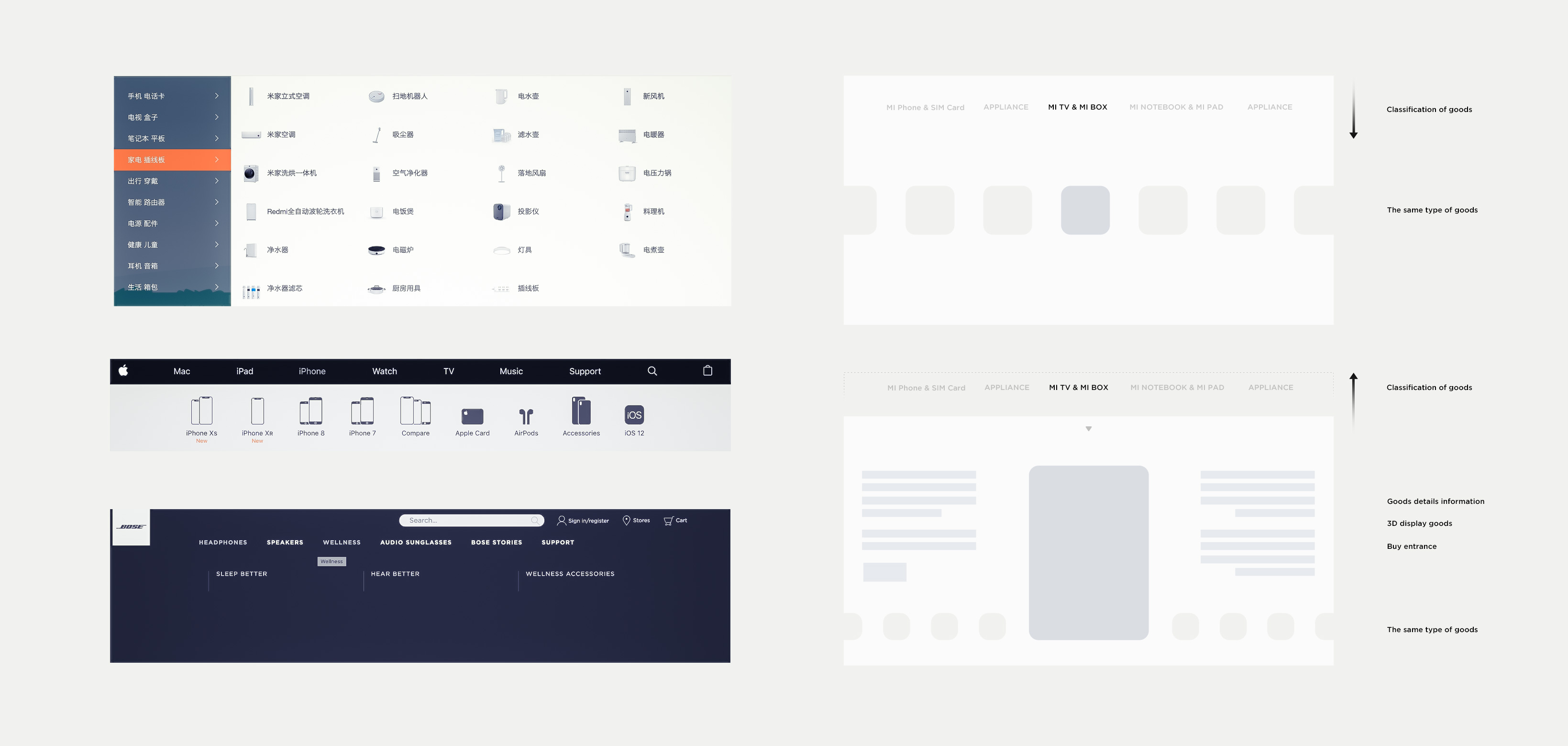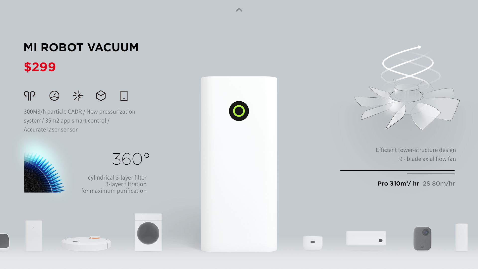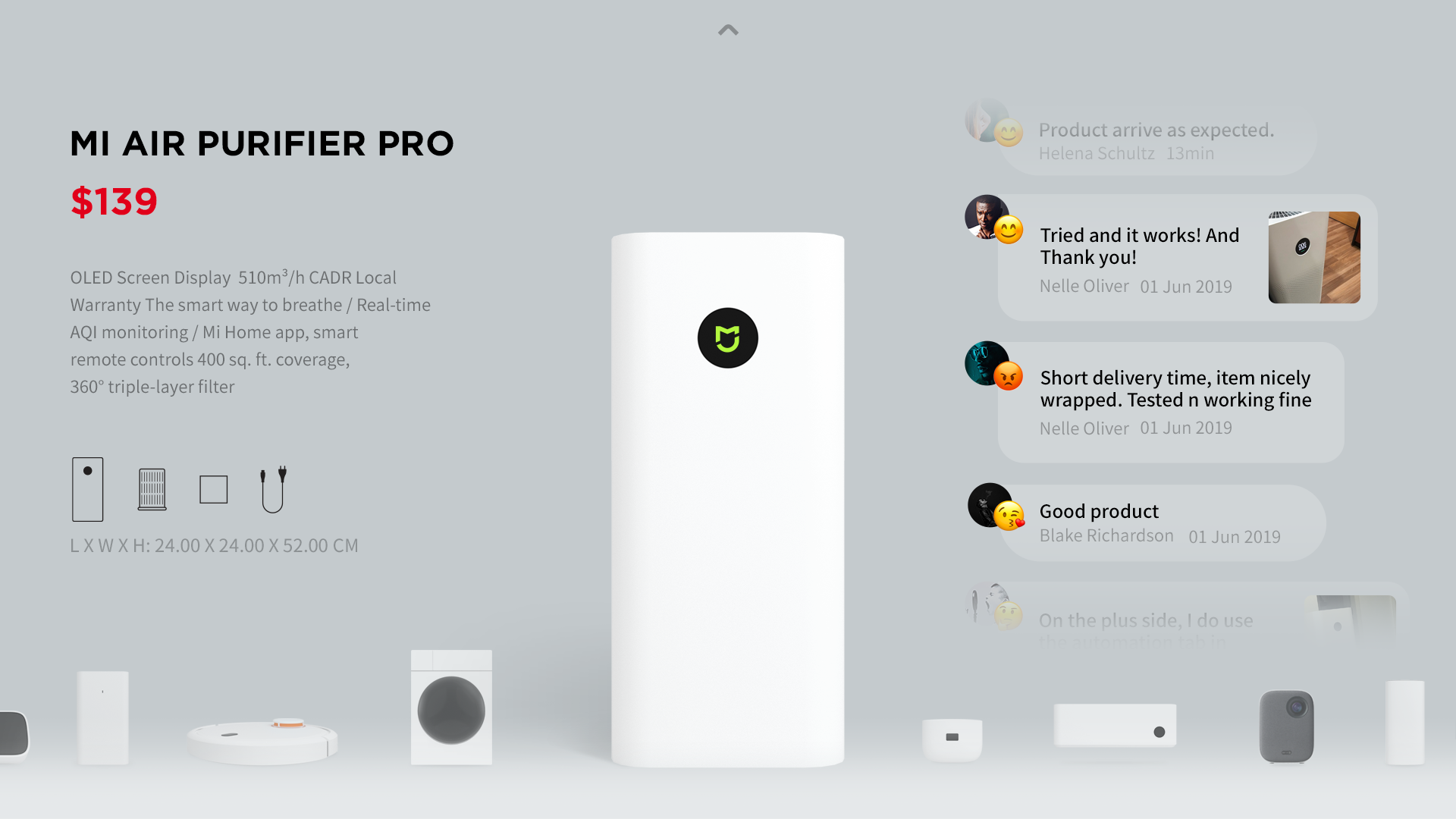 这个是从实景商城首页进入的所有商品列表页面,此设计的独特性在于最大化的去展示产品性能和外观的美,层级通过上下两层简单的上下键来切换,商品详情页把商品的信息最大化,通过三维旋转和信息图形展示产品硬件细节和内部构造,通过动画显示出产品工作时的状态,通过评论和用户晒单实拍图片展示产品体现真实优秀特性。统一的色调也是全方位在设计上定义了小米产品的品牌定位和公司气质。永远做高端的产品最低的价格。