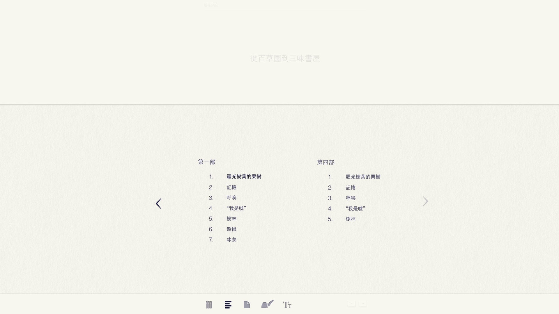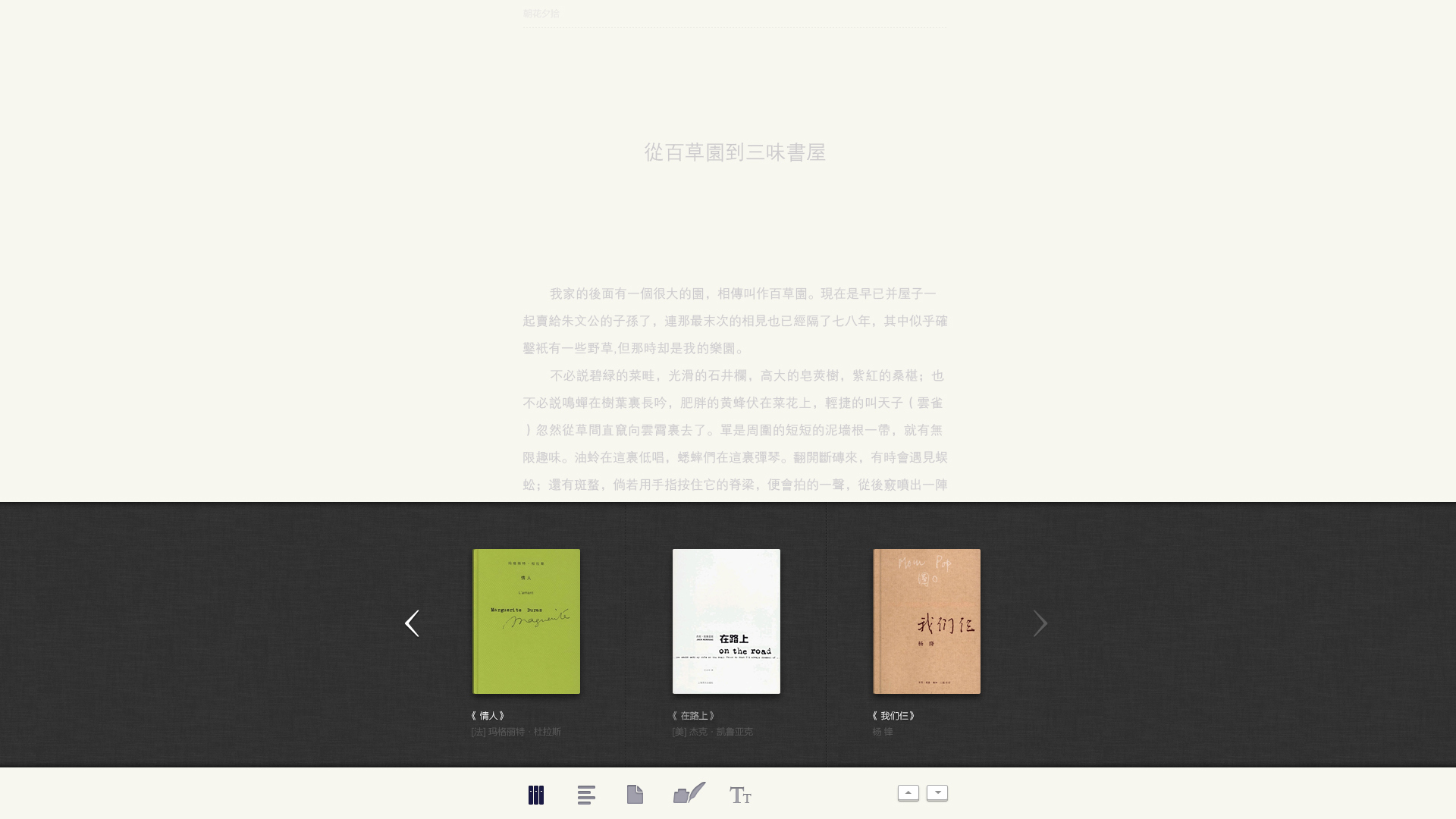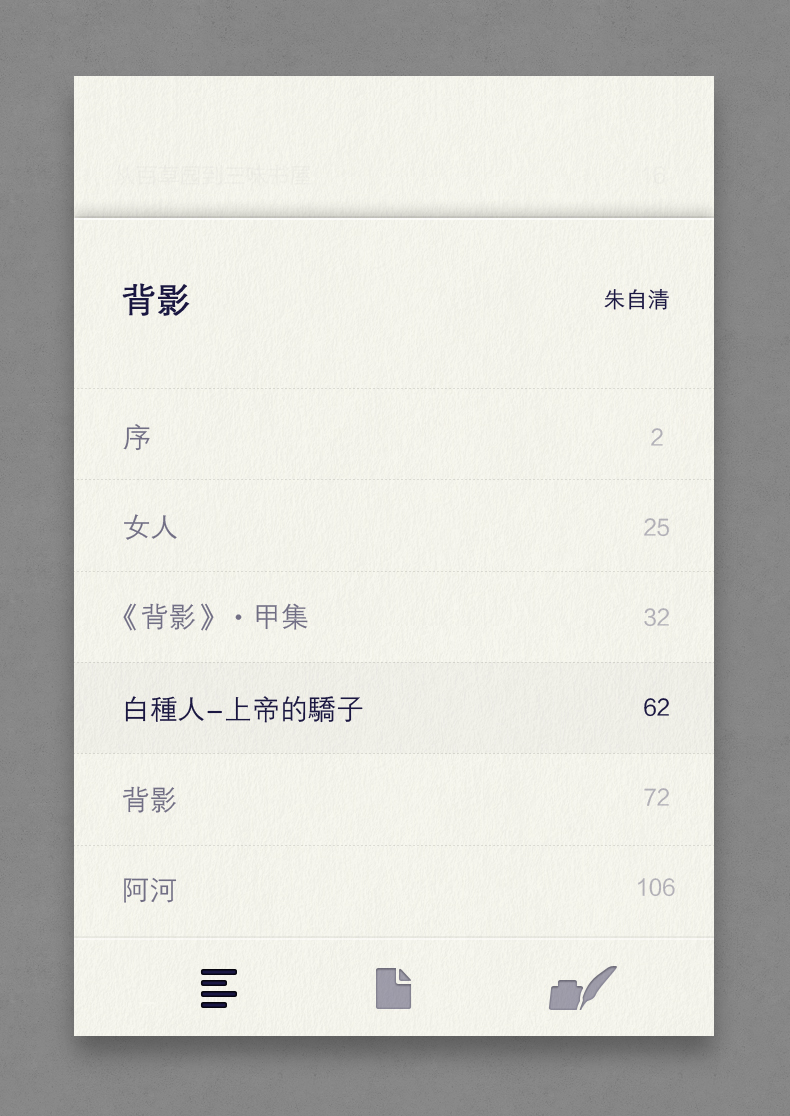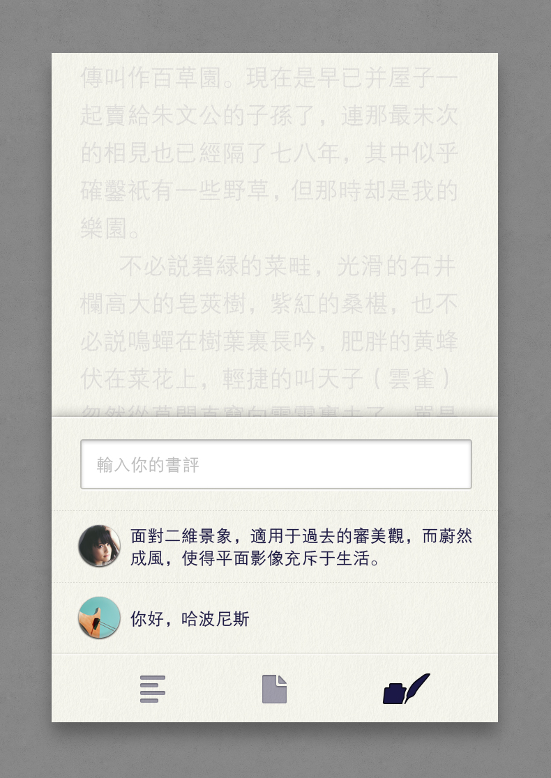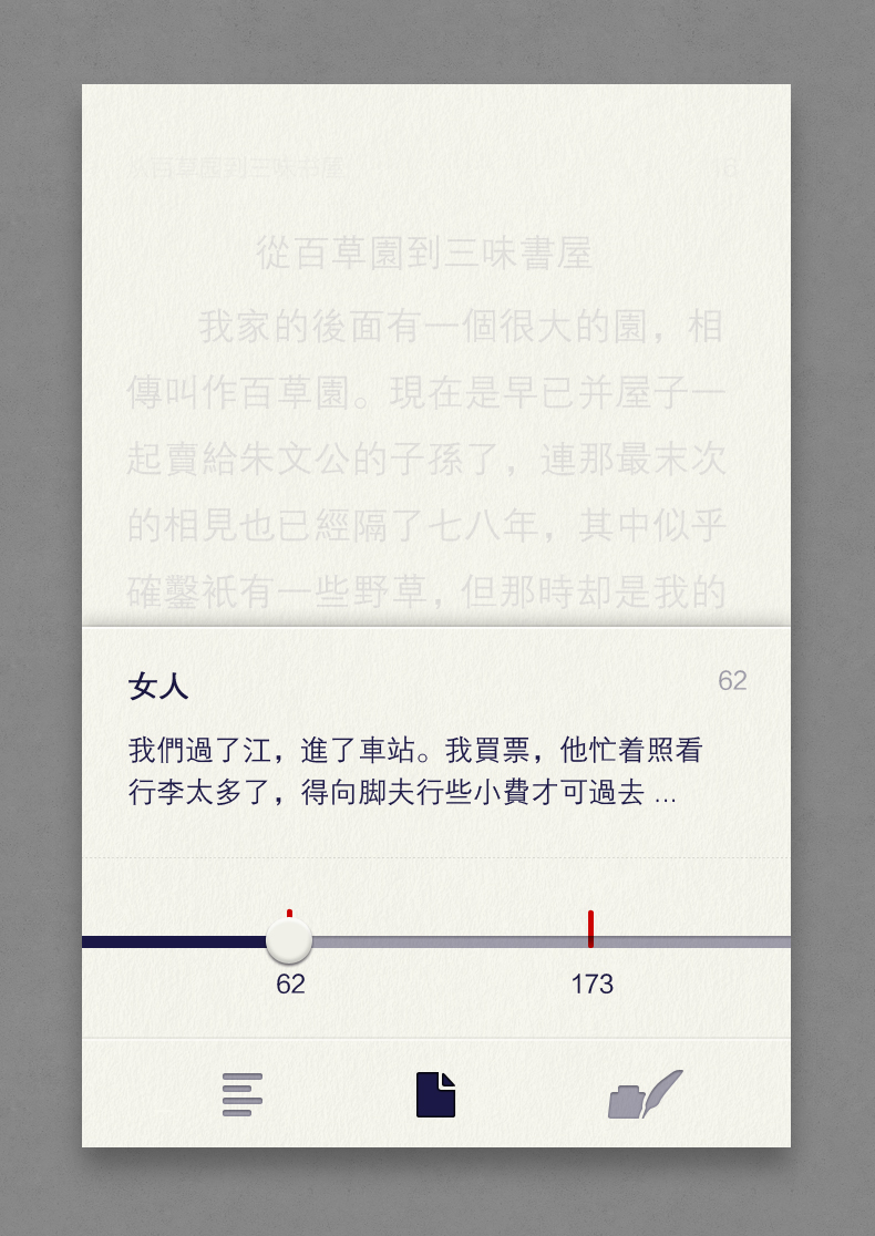 The interaction style of book marks is changed into the traditional bevel-style marks, in order to return the reading mark behaviors in a more natural manner. For the icon design, an abstract form with contradicted space is made in attempt, expressing a state of being immersed in reading. The book is a place where people pick up the soul.